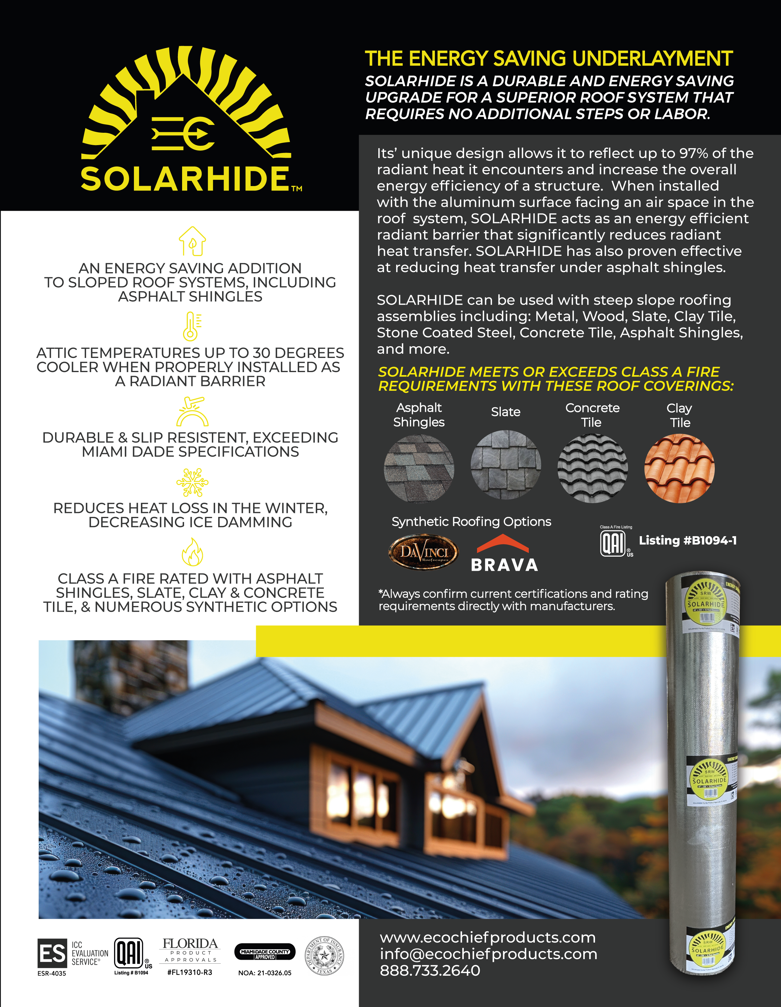 SOLARHIDE is a durable and energy saving upgrade for a superior roof system that requires no additional steps or labor. Its’ unique design allows it to reflect up to 97% of the radiant heat it encounters and increase the overall energy efficiency of a structure. When installed with the aluminum surface facing an air space in the roof system, SOLARHIDE acts as an energy efficient radiant barrier that significantly reduces radiant heat transfer. SOLARHIDE has also proven effective at reducing heat transfer under asphalt shingles.