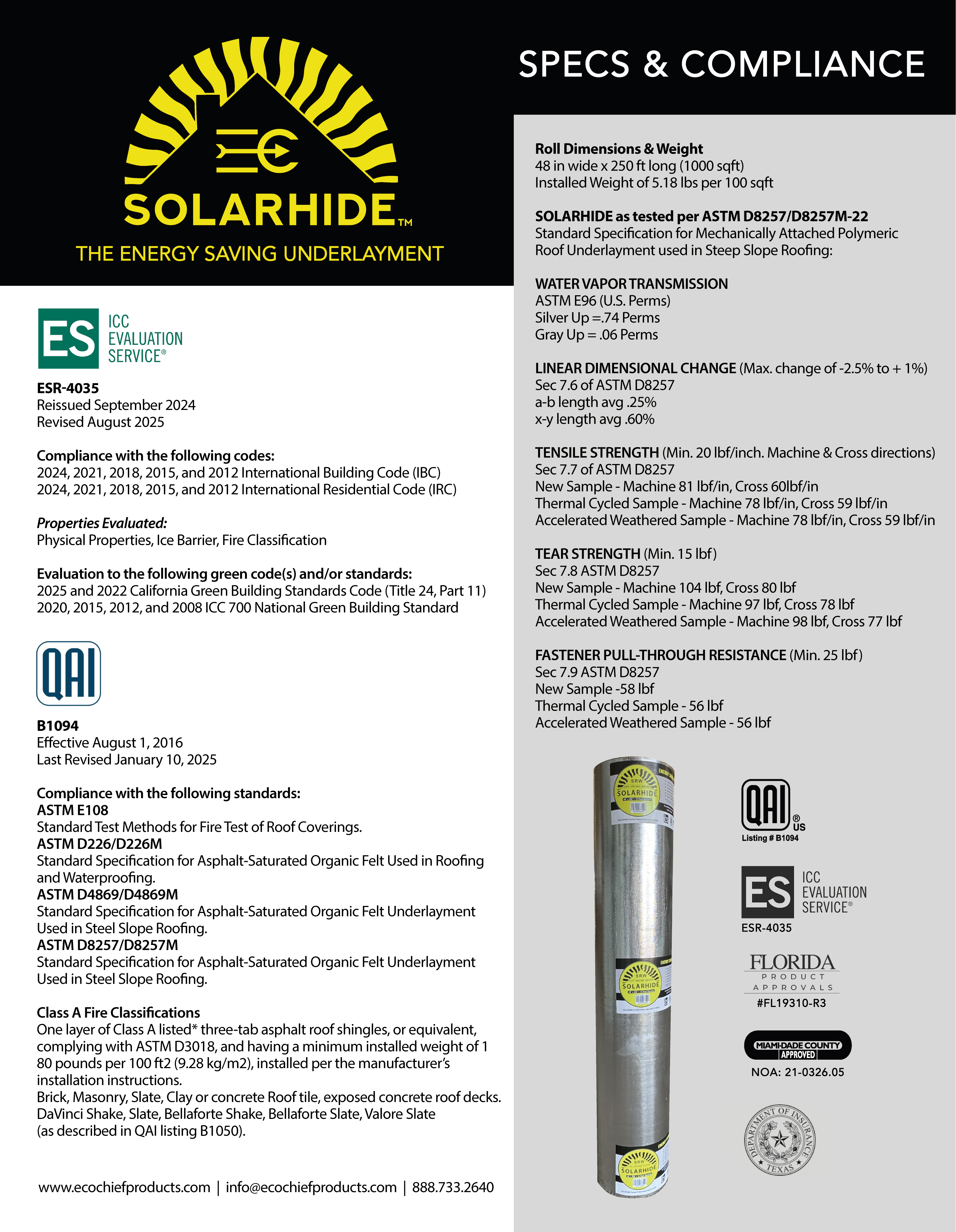 SOLARHIDE-SRW is one component of a high quality roof system. Always make sure your roof system has proper ventilation, and be sure to check and follow all applicable local building codes. SOLARHIDE-SRW meets or exceeds requirements for ASTM D-226, D-4869, and D-8257M